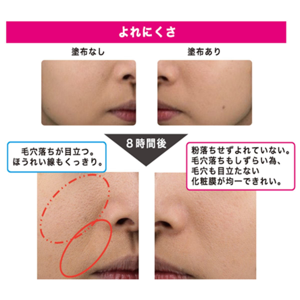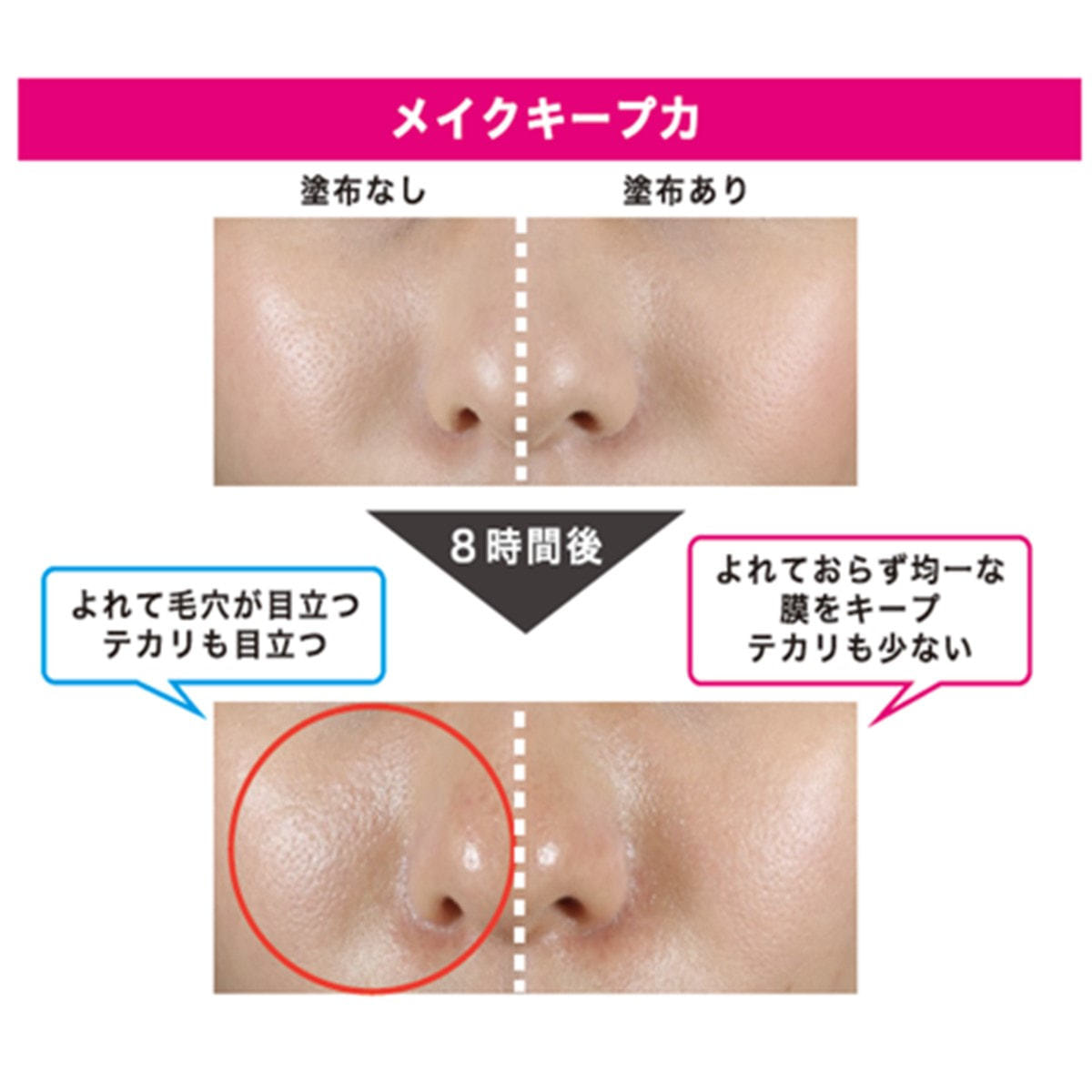 テカリだけでなく、メイクの毛穴落ちまで防ぎます。
